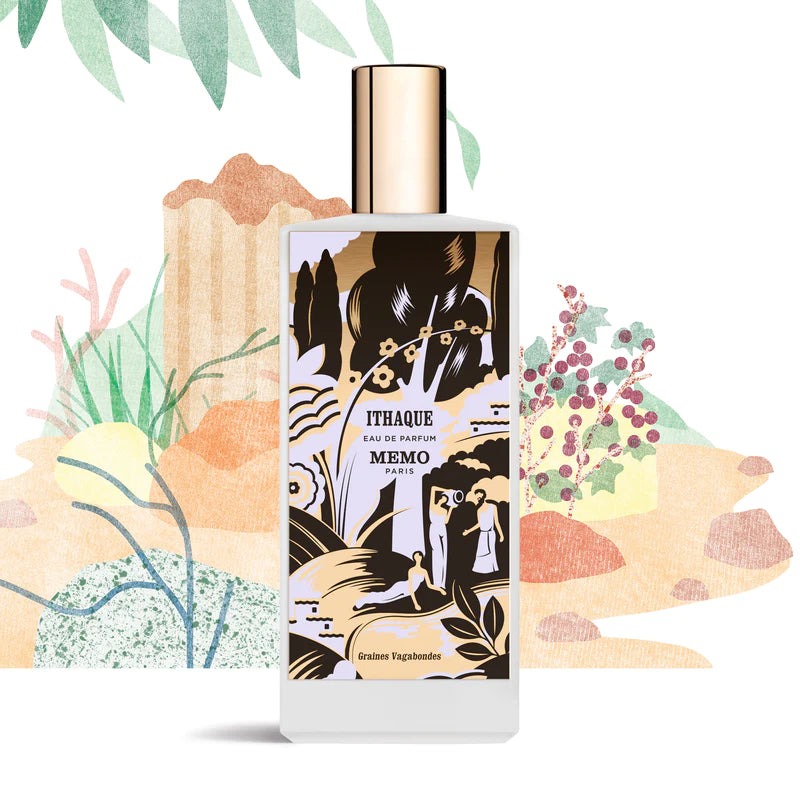 A propos du flacon : la plaque d'Ithaque s'inspire d'un paysage typique de la Grèce antique, où la nature s'épanouit à chaque coin de rue.